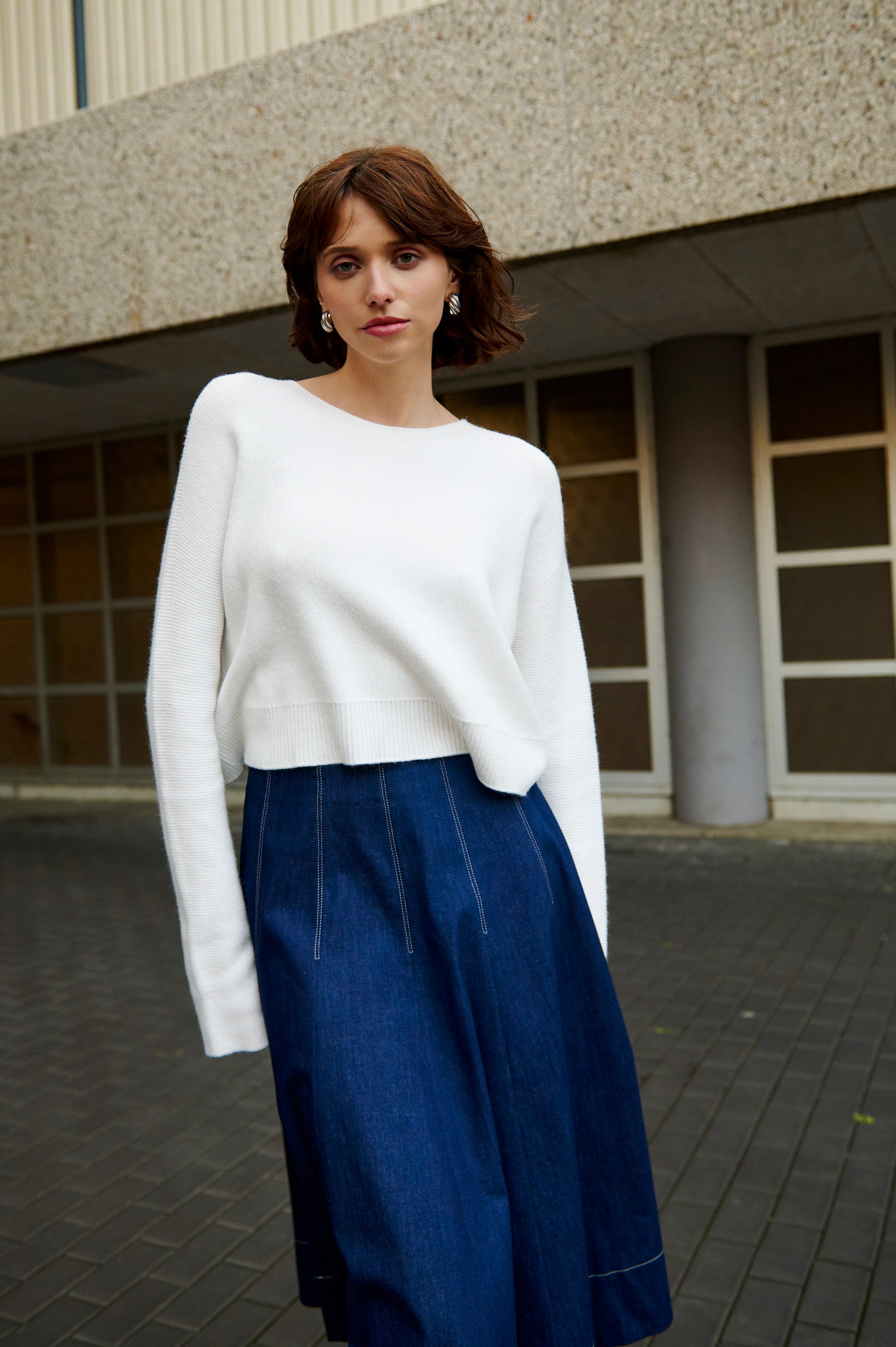 Deze trui combineert een minimalistisch design met maximaal comfort. Gemaakt van een zachte viscosemix, valt de NB2167 op door zijn naadloze afwerking en elegante eenvoud. De licht boxy snit, ronde hals en strakke lange mouwen maken hem perfect voor zowel laagjes als solo gebruik. De verfijnde pasvorm in zacht offwhite past moeiteloos bij rokken en nette broeken.