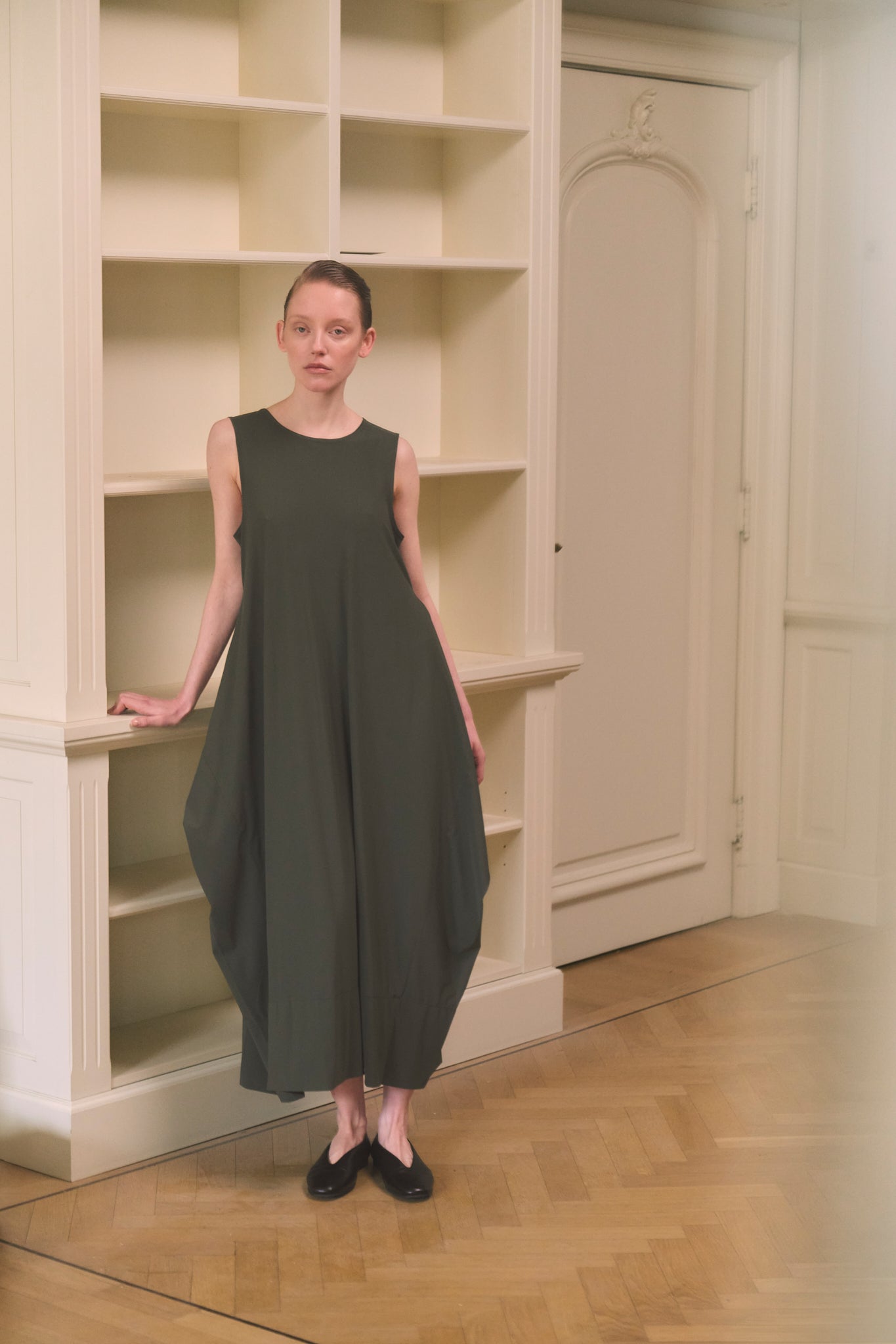 De Jackie Dress van Jane Lushka combineert minimalisme met moderne elegantie. Gemaakt in Europa van glad, rekbaar technisch jersey, heeft deze mouwloze jurk een ronde halslijn en een relaxed, zacht gedrapeerd silhouet. De subtiele plooidetail aan de voorkant en de vloeiende midi-lengte zorgen voor moeiteloze beweging, terwijl de rechte snit tijdloos en veelzijdig blijft — perfect voor zowel dagelijks gebruik als geklede combinaties.