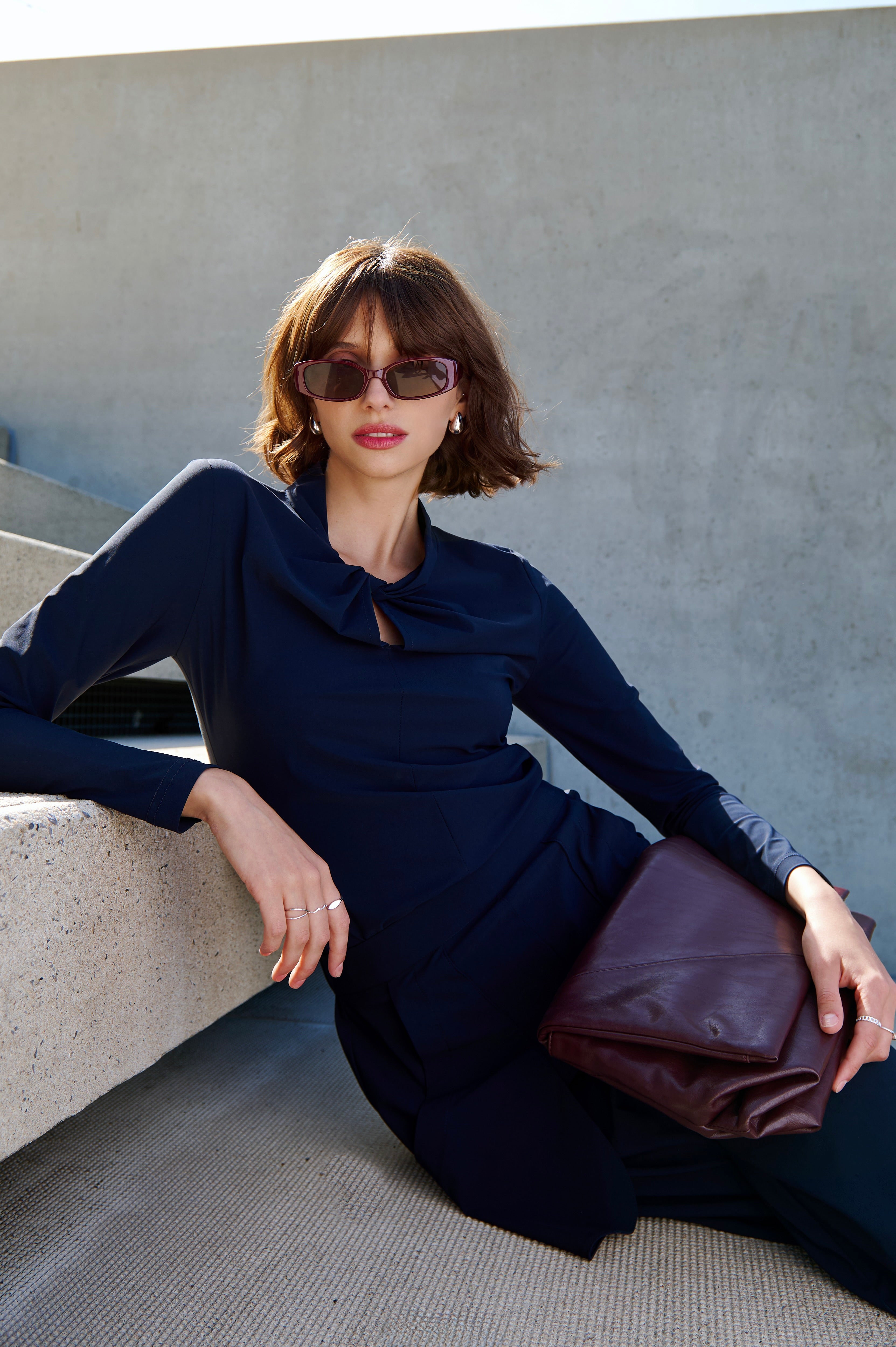 Een tijdloos item met verfijnde eenvoud, de Gaara Dress heeft een gestructureerde pasvorm versterkt door zachte technische jersey. Met een V-hals en 3/4-mouwen flatteert het de figuur en biedt het de hele dag comfort. De midirok met subtiele plooien en een geaccentueerde tailleband creëert een verfijnde, vrouwelijke look — ideaal voor op het werk of speciale gelegenheden.