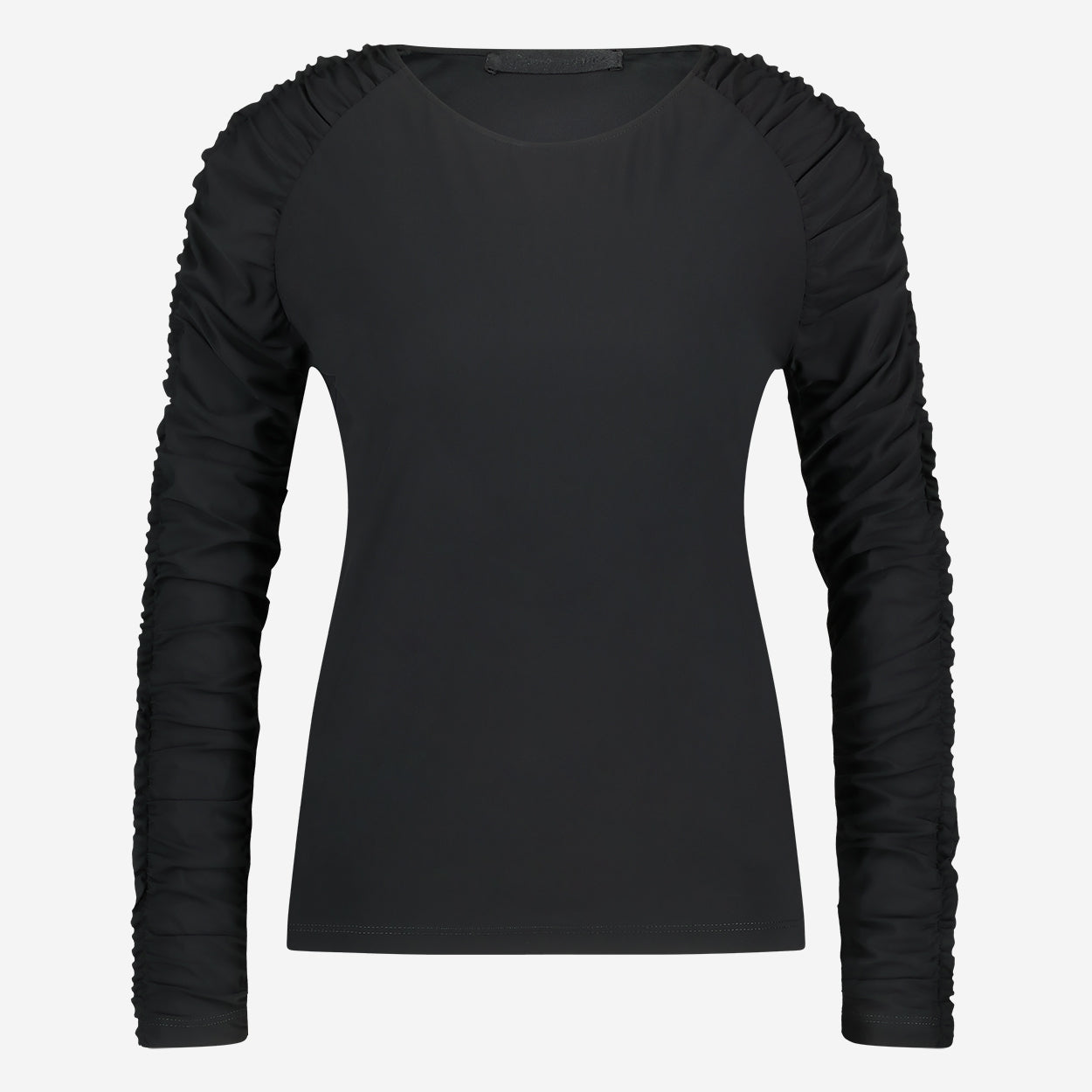 Carlin Top: Verhoog je garderobe met de Carlin Studio Top, gemaakt van hightech jersey. Deze top heeft een slank silhouet en opgerolde lange mouwen en combineert moderne stijl met comfort.