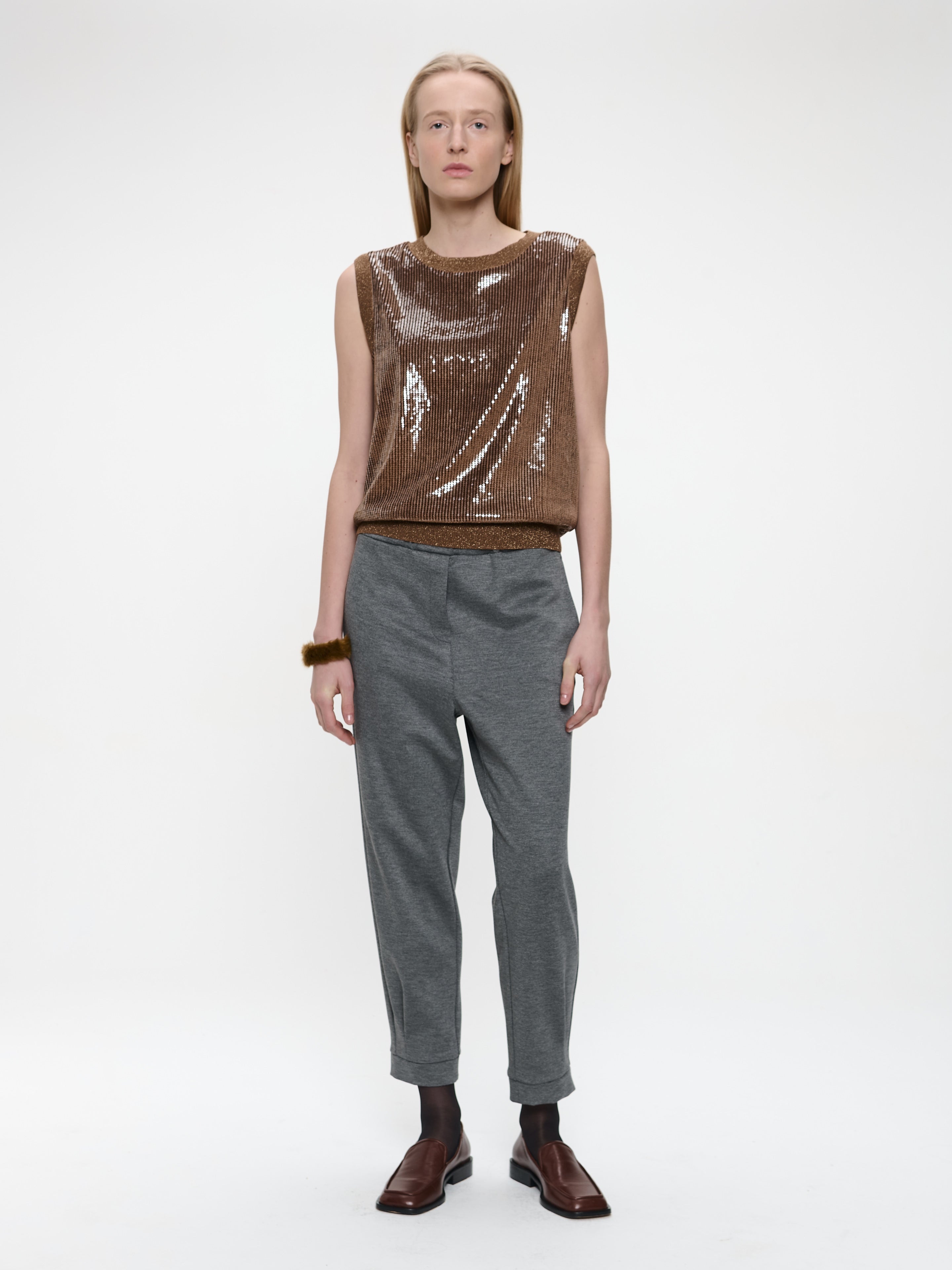 Verhoog je avondlook met de Pallino Sequins Top – een schitterend statementstuk dat de essentie van feestelijke elegantie vangt. Gemaakt van gerecyclede materialen en versierd met een glinsterende zilveren paillettenafwerking, combineert deze mouwloze top moeiteloos duurzaamheid en stijl. De klassieke silhouet met opgerolde manchetten en zachte ronde hals zorgt voor een flatterende pasvorm die zowel chique als comfortabel is.