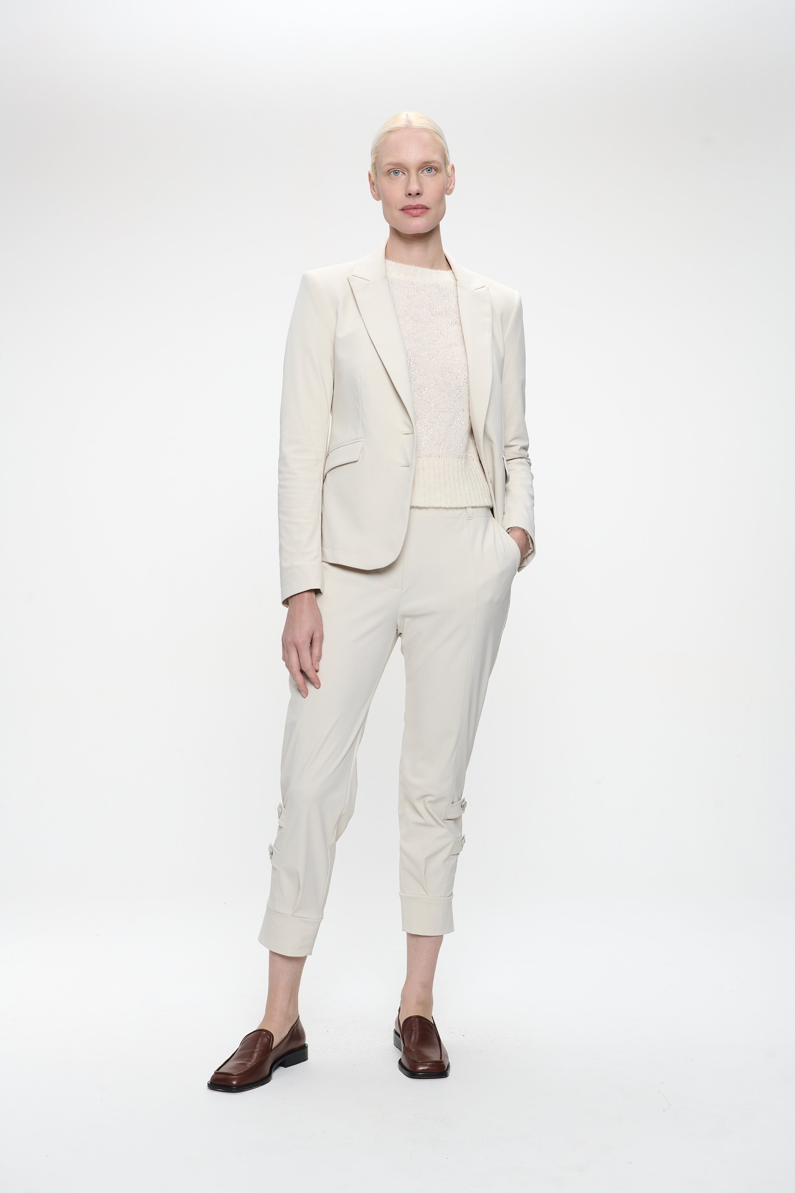 De Delia Pants vormen de perfecte balans tussen elegantie en comfort. Gemaakt van geborsteld technisch jersey met een suède-achtige touch, hebben ze een cropped, taps toelopende pijp met decoratieve knoopdetails aan de zoom. Dankzij hun verfijnde silhouet zijn ze een veelzijdige aanvulling op je garderobe – ideaal voor werk, reizen of een avondlook.