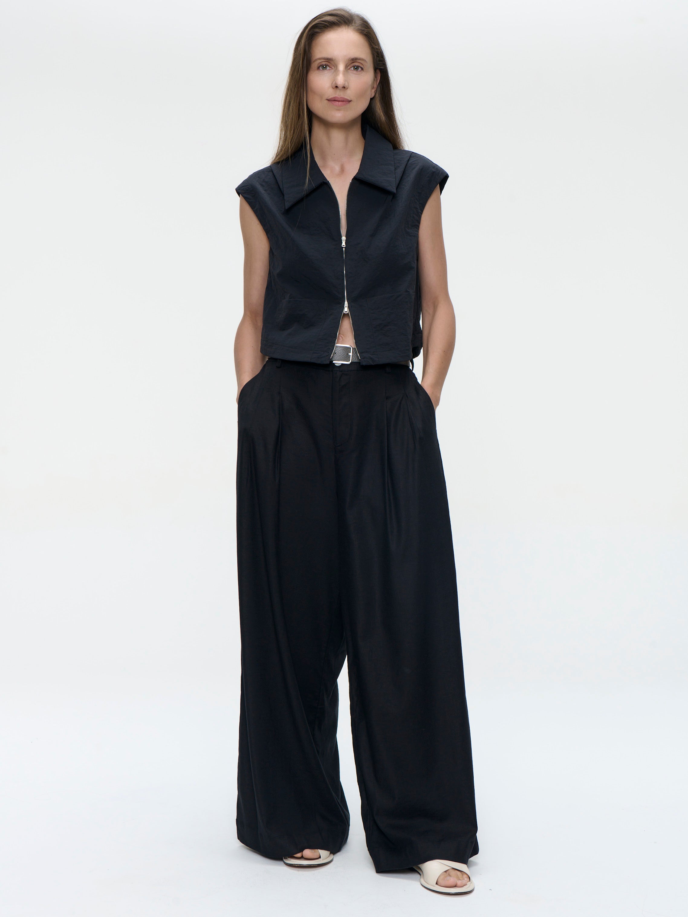 Stap in de wereld van modern minimalisme met de Emiko Taffeta Jacket – een stijlvolle, mouwloze jas die perfect balans biedt tussen structuur en comfort. Gemaakt van lichtgewicht nylon-taft, met een korte lengte, scherpe kraag en ritssluiting aan de voorkant voor een strakke, eigentijdse look. De losse pasvorm zorgt voor draagcomfort en veelzijdigheid – ideaal om te combineren met zowel casual als geklede outfits.