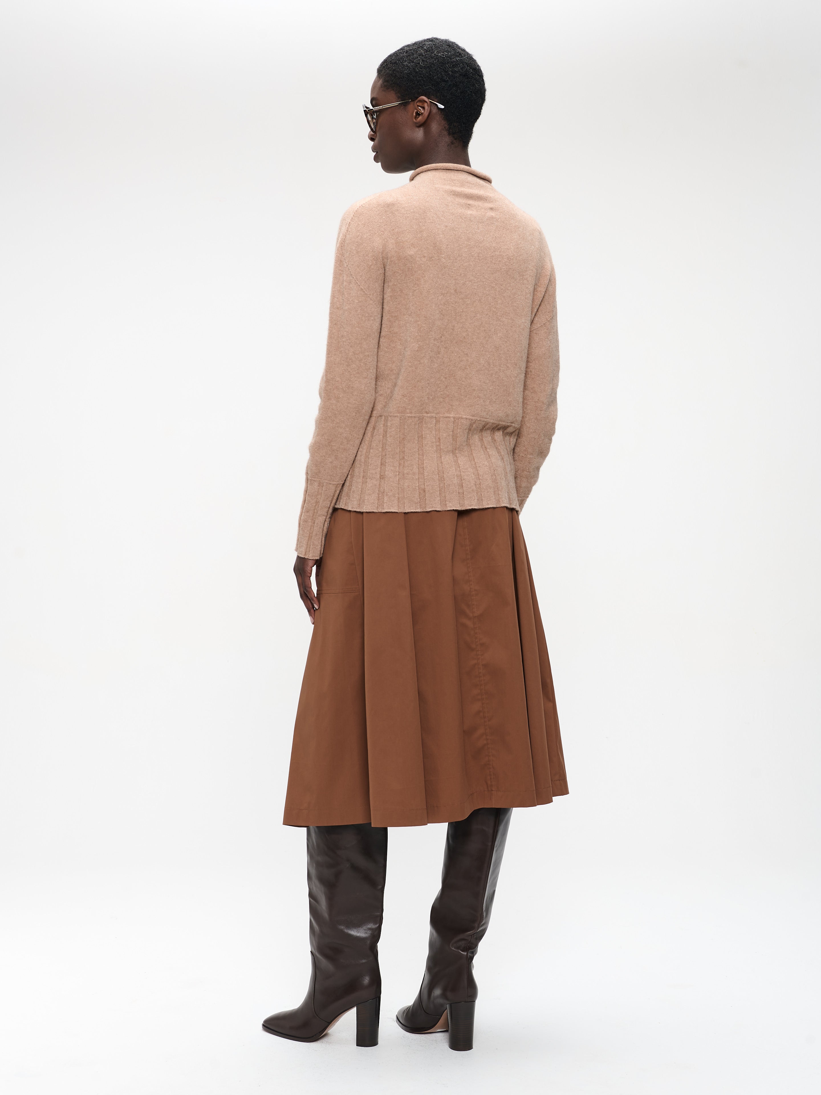De Raffaele poplin rok is een verfijnde A-lijn rok, vervaardigd uit stevig katoenpoplin met een gestructureerd silhouet. De hoge taille, verstelbare trekkoordriem en elegante plooien zorgen voor een flatterende en vrouwelijke vorm, terwijl de camel kleur een warme, seizoenstint geeft. Perfect te combineren met gebreide kleding of gestructureerde tops voor een tijdloze en comfortabele look.